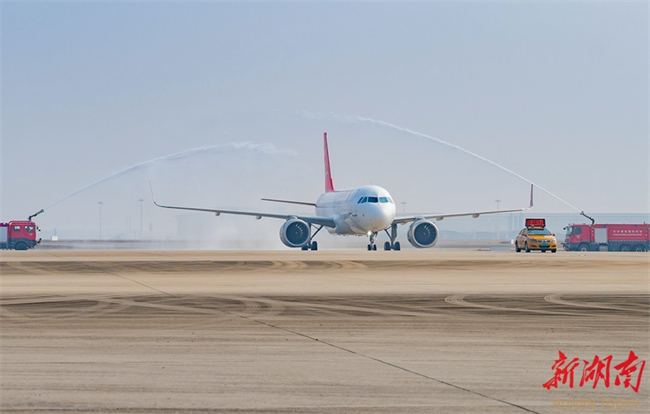 A new Airbus A320NEO aircraft, numbered B-32Q6, landed at Changsha Huanghua International Airport at 10:52 on the morning of December 10. With its addition, the Air Travel has expanded its fleet size to 17 aircrafts. This new aircraft accommodates 186 seats in an all economy-class cabin. It will be put into service for the winter flight season and the Spring Festival travel rush in the coming year. The photo shows the new aircraft receives a water cannon salute—the highest honor in civil aviation. (Photo/Xu Xing, Hunan Daily)